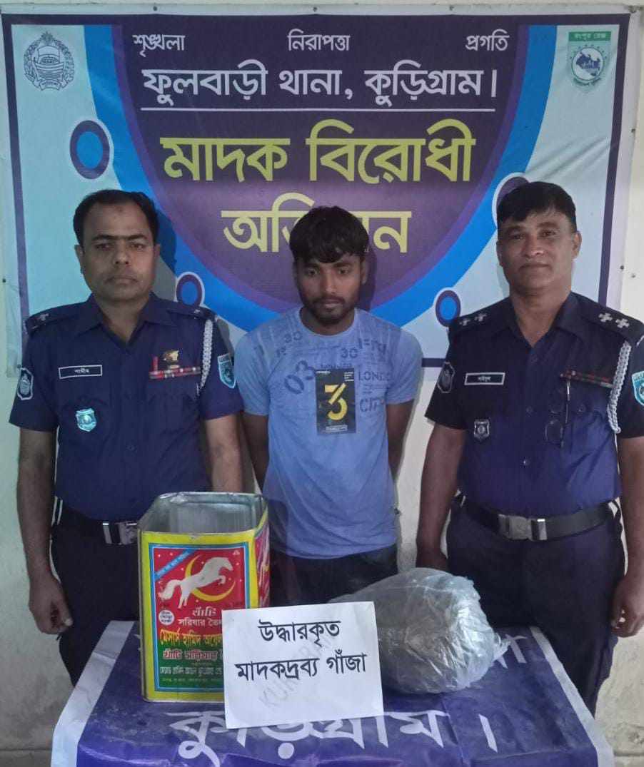 বৃহস্পতিবার পুলিশ জানায়, কুড়িগ্রাম জেলার ফুলবাড়ী থানার একটি চৌকস টিম (২১ মার্চ) ভোরে ফুলবাড়ী থানাধীন ১নং নাওডাঙ্গা ইউনিয়নের কৃষ্ণানন্দ বক্সী গ্রামের কুখ্যাত মাদক কারবারি মোঃ আনোয়ার হোসেন (৫৩) এর বসতবাড়িতে মাটির নিচে বিশেষ কায়দায় লুকানো ৬ কেজি ৫০০ গ্রাম গাঁজা এবং ৪৮ বোতল ইস্কাফসহ হাতেনাতে গ্রেফতার করে।