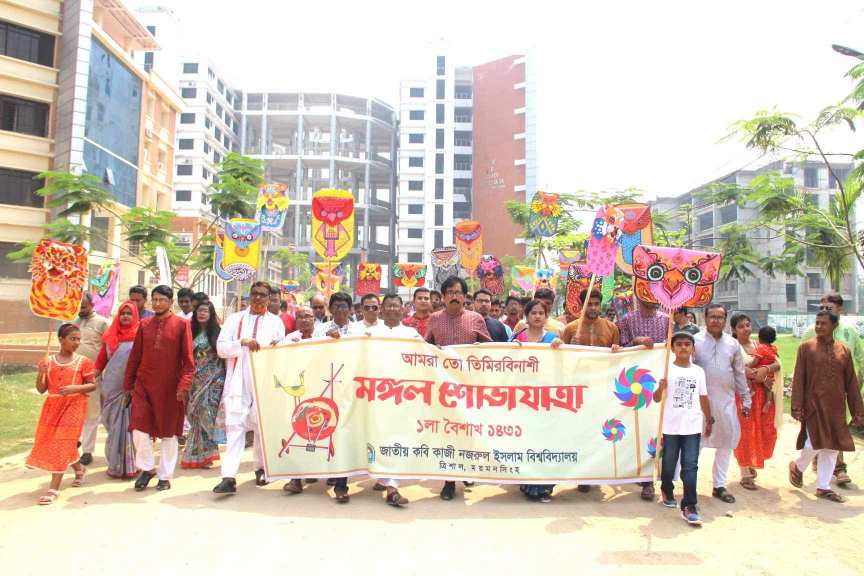 বাঙালিয়ানাকে ধারণ করে উচ্ছ্বাস ও আনন্দের সাথে বাংলা নববর্ষ-১৪৩১ কে বরণ করে নিয়েছে জাতীয় কবি কাজী নজরুল ইসলাম বিশ্ববিদ্যালয়। দিবসটি উপলক্ষ্যে রোববার (১৪ এপ্রিল) সকালে ‘আমরা তো তিমিরবিনাশী’ শীর্ষক প্রতিপাদ্যকে ধারণ করে মাননীয় উপাচার্য প্রফেসর ড. সৌমিত্র শেখরের নেতৃত্বে মঙ্গল শোভাযাত্রা করা হয়। শিক্ষক-শিক্ষার্থী, কর্মকর্তা-কর্মচারী, নানা বয়সের দর্শনার্থীরা শোভাযাত্রায় স্বত:স্ফূর্ত অংশগ্রহণ করেন।