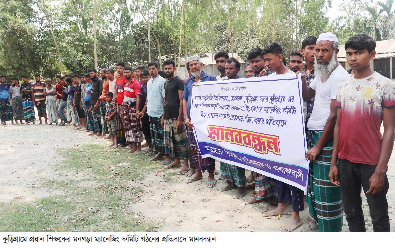 এসময় প্রধান শিক্ষকের মনগড়া কমিটি বাতিল ও নির্বাচন প্রক্রিয়ার মাধ্যমে কমিটি গঠনের দাবী জানান তারা। অন্যথায় পরবর্তীতে কঠোর কর্মসূচী গ্রহণ করার ঘোষণা দেন বক্তারা। মানববন্ধন শেষে তারা কুড়িগ্রাম জেলা প্রশাসকসহ বিভিন্ন দপ্তরে স্মারকলিপি প্রদান করেন।