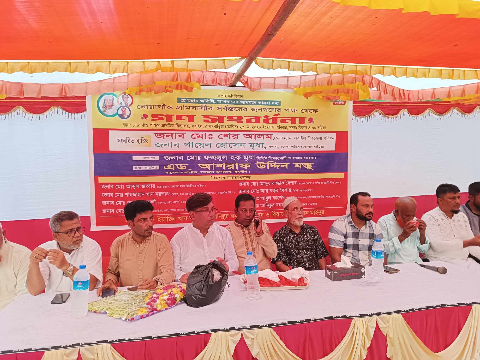 সরাইল উপজেলার নোয়াগাঁও ইউনিয়নে নবনির্বাচিত পরিষদের চেয়ারম্যান মো. শের আলম মিয়া ও জেলা পরিষদের সদস্য পায়েল হোসেন মৃধা কে সংবর্ধনা প্রদান করা হয়েছে। অনুষ্ঠানের শুরুতে কোরআন তেলাওয়াত করেন স্থানীয় ৩ নং ওয়ার্ড আওয়ামী লীগের সভাপতি জনাব রহিছ আলী।