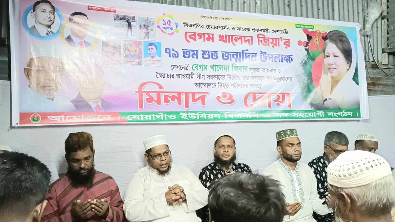 নারায়ণগঞ্জের সোনারগাঁয়ে নোয়াগাঁও ইউনিয়ন বিএনপির উদ্যোগে খালেদা জিয়ার ৭৯ তম জন্মদিন উপলক্ষে বেগম জিয়ার রোগ মুক্তি ও দীর্ঘায়ু কামনা করে মিলাদ মাহফিল অনুষ্ঠিত হয়েছে, বৈষম্য বিরোধী ছাত্র আন্দোলনের নিহত আহতদের স্মরণে এ সময় দোয়া মোনাজাত করা হয়।