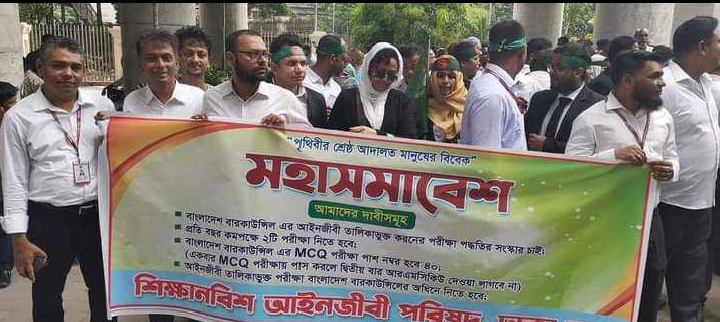 বাংলাদেশ বৈষম্য বিরোধী শিক্ষা নবিশ আইনজীবী ঐক্য ফোরাম এর ভারপ্রাপ্ত আহবায়ক রনি আহম্মেদ এর নেতৃত্বে বার কাউন্সিল ভবনের সামনে ৬ দফা দাবী আদায়ের লক্ষ্যে এক মহা সমাবেশ করছেন আইনের উপর ডিগ্রীধারী শিক্ষা নবিশ আইনজীবীরা।এতে সারা বাংলাদেশের প্রত্যেক জেলা বার থেকে শিক্ষা নবিশ আইনজীবীরা দলে দলে ভেনার ফেস্টুন সাথে নিয়ে।