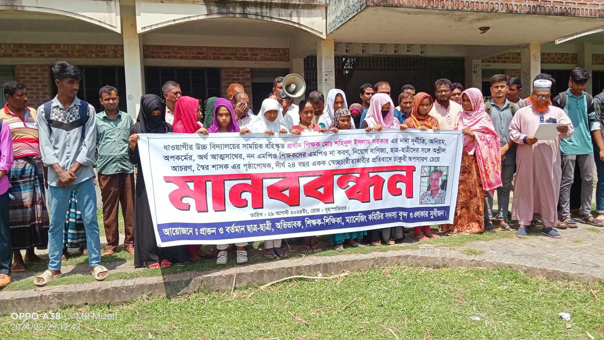 দুর্নীতি, অনিয়ম, অপকর্ম, অর্থ আত্মসাথ, নন এমপিও শিক্ষকদের এমপিও না করণ, নিয়োগ বাণিজ্য, ছাত্র-ছাত্রীদের সঙ্গে অশ্লীল আচরন ও দীর্ঘ ২৪ বছর একক স্বেচ্ছাচারিতার অভিযোগে বরখাস্তকৃত প্রধান শিক্ষক শহিদুল ইসলাম সরকার মর্তুজার অপসরণ চেয়ে বৃহস্পতিবার ১২ টায় উপজেলার ধাওয়াগীর উচ্চ বিদ্যালয় মাঠে এ মানববন্ধন অনুষ্ঠিত হয়।