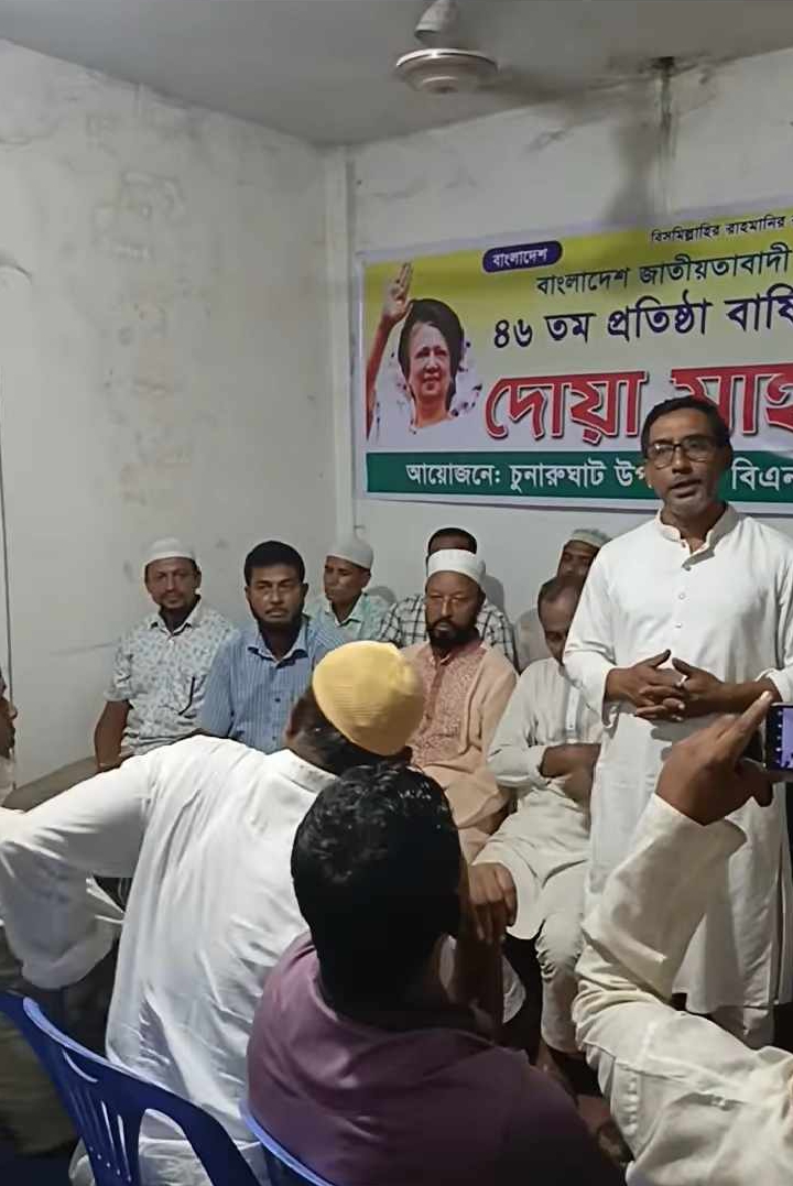 হবিগঞ্জ জেলার চুনারুঘাট উপজেলা বিএনপির উদ্দ্যোগে আজ ১ লা সেপ্টেম্বর রোজ রবিবার বাংলাদেশ জাতীয়তাবাদী দল (বিএনপি) ৪৬ তম প্রতিষ্ঠা বার্ষিকী ও শহীদ প্রেসিডেন্ট জিয়াউর রহমান, আরাফাত রহমান খুকু সহ ছাত্র আন্দোলনের সকল শহীদ দের মাগফেরাত কামনা এবং বেগম খালেদা জিয়ার সুস্থতা কামনা করে চুনারুঘাট উপজেলা বিএনপির অফিসে এক মিলাদ মাহফিল অনুষ্ঠিত হয়।