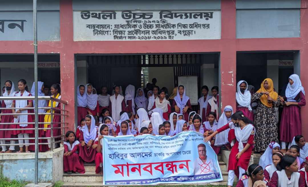বগুড়ার শিবগঞ্জের উথলী উচ্চ বিদ্যালয়ের প্রধান শিক্ষক হাবিবুর আলমের অপসারণের দাবিতে মানববন্ধন করেছেন শিক্ষার্থীরা। সোমবার (২ সেপ্টেম্বর) সকাল ১০টা থেকে শুরু করে ঘণ্টাব্যাপী মানববন্ধন শেষে বিক্ষোভ করেন তাঁরা। প্রধান শিক্ষকের পদত্যাগ নিশ্চিত করতে শিক্ষার্থীরা স্কুল গেট থেকে শুরু করে আমতলী বাজার প্রদক্ষিণ শেষে ইউএনও বরাবর স্মারকলিপি প্রদান করেন। মানববন্ধনে শতাধিক শিক্ষার্থী ও অভিভাবকরা উপস্থিত ছিলেন।