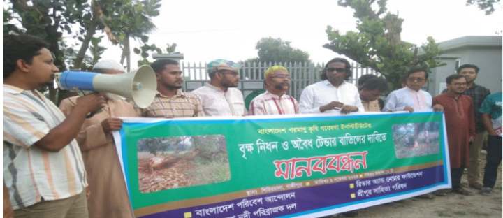 বাংলাদেশ পরমাণু কৃষি গবেষণা ইনস্টিটিউটের বিনা আঞ্চলিক গবেষণা কেন্দ্রে নতুন ভবন (গবেষণাগার) নির্মাণে শতবর্ষী বৃক্ষ নিধন ও অবৈধ টেন্ডার বাতিলের দাবিতে মানববন্ধন অনুষ্ঠিত হয়েছে।