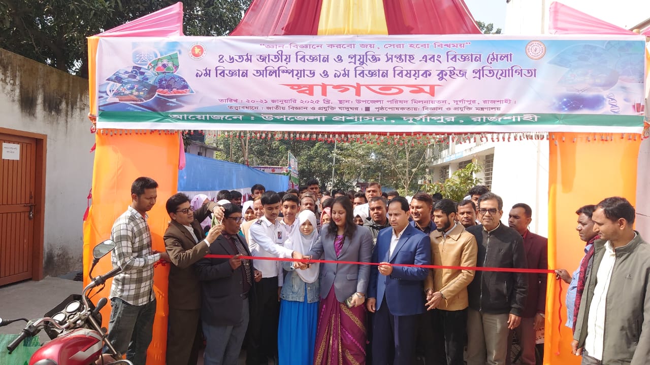 রাজশাহী দুর্গাপুর উপজেলা প্রশাসনের আয়োজনে ৪৬ তম জাতীয় বিজ্ঞান ও প্রযুক্তি সপ্তাহ উপলক্ষে দুই দিনব্যাপী বিজ্ঞান ও প্রযুক্তি মেলা শুরু হয়েছে। সোমবার (২০ জানুয়ারি) বেলা সাড় ১১টার সময় উপজেলা পরিষদ চত্বরে ফিতা কেটে এ মেলার উদ্বোধন করেন উপজেলা নির্বাহী কর্মকর্তা সাবরিনা শারমিন। এ সময় উপস্থিত ছিলেন- সহকারী কমিশনার (ভূমি) সুমন চৌধুরী, উপজেলা মাধ্যমিক শিক্ষা অফিসার দুলাল আলম , দুর্গাপুর থানার অফিসার ইনচার্জ (ওসি) দুরুল হোদা, উপজেলা প্রাণীসম্পদ অফিসার জান্নাতুল ফেরদৌস, উপজেলা কৃষি অফিসার সাহানা পারভিন লাবনী, উপজেলা স্বাস্থ্য কমপ্লেক্সের স্বাস্থ্য কর্মকর্তা রুহুল আমিন, উপজেলা মৎস্য অফিসার আমিরুল ইসলাম, উপজেলা প্রকৌশলী মাসুুক ই-মোহাম্মদ, প্রকল্প বাস্তবায়ন অফিসার নুরে শেফা, একাডেমিক সুপারভাইজার মহিদুল ইসলাম, দারিদ্র্য বিমোচন ও পল্লী উন্নয়ন অফিসার নজরুল ইসলাম, উপজেলা হিসাব রক্ষণ অফিসার বাবুল হক, সমাজসেবা অফিসার আ.ন.ম রাকিবুল ইউসুফ, সমবায় অফিসার আজগর আলী, আনসার ভিডিপি অফিসার সেলিনাসহ কলেজ ও সকল মাধ্যমিক শিক্ষা প্রতিষ্ঠানের দায়িত্বরত শিক্ষক-শিক্ষিকা বৃন্দ। উদ্বোধন শেষে মেলার স্টলগুলো পরিদর্শন করেন আমন্ত্রিত অতিথিবৃন্দরা। মেলায় ১৪টি স্টল প্রদর্শন রয়েছে। মেলায় উপজেলার বিভিন্ন বিদ্যালয় ও কলেজ থেকে আসা শিক্ষার্থীরা প্রযুক্তি ব্যবহার করে বিদ্যুৎ সাশ্রয়ী জীবন ধারণ, সৌরজগতের গঠন এর কার্যক্রম, প্রত্যাশিত নগর, পরিবেশ সুরক্ষার মডেল, বজ্র পদার্থ থেকে বিদ্যুৎ উৎপাদন, পারমাণবিক বিদ্যুৎ কেন্দ্র, উন্নত স্বাস্থ্যের প্রকল্প, স্মার্ট সিকিউরিটি, সৌর চুল্লি, স্মার্ট বাংলাদেশে বিনির্মাণে ক্ষুদে বিজ্ঞানীদের চিন্তা ভাবনা, স্মার্ট এন্ড ডিজিটাল বাংলাদেশ প্রকল্পসহ নানা উদ্ভাবনী প্রদর্শন করছেন। উপজেলা নির্বাহী কর্মকর্তা সাবরিনা শারমিন বলেন, বিজ্ঞান ও প্রযুক্তির জগতে বৈপ্লবিক পরিবর্তন আনবে এ বিজ্ঞান মেলা। বিশেষ করে তরুণ সমাজকে জ্ঞান চর্চায় উদ্বুদ্ধ এবং তাদের উদ্ভাবনী ক্ষমতাকে বিকশিত করার অপূর্ব সুযোগ এ মেলা। সেই কারণে দুর্গাপুরে বিজ্ঞান মেলার আয়োজন করা। এই মেলা থেকে শিক্ষার্থীরা স্মার্ট বাংলাদেশ বিনির্মাণে নিজেদেরকে তৈরি করতে পারবো।