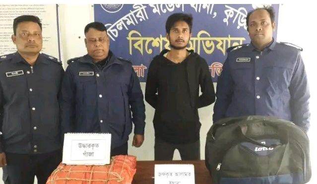 কুড়িগ্রামের চিলমারীতে মাদকবিরোধী অভিযান করে ৫ কেজি ১০০ গ্রাম গাঁজা ও ৩০০ পিস ইয়াবাসহ এক যুবককে গ্রেপ্তার করেছে পুলিশ। মঙ্গলবার (২৮ জানুয়ারি) দুপুর একটা পয়তাল্লিশ মিনিটের দিকে চিলমারী উপজেলার রমনা ঘাটে এলাকায় অভিযান চালিয়ে তাকে গ্রেপ্তার করা হয়েছে। গ্রেপ্তারের বিষয়টি নিশ্চিত করেছেন চিলমারী মডেল থানার অফিসার ইনচার্জ নাজমুস সাকিব সজিব। গ্রেপ্তার যুবকের নাম শামীম হোসেন (২৩)। তিনি কুড়িগ্রাম জেলার ভূরুঙ্গামারী থানার পাথরডুবি ইউনিয়নের ময়দান গ্রামের বাসিন্দা আশরাফ আলী ছেলে। পুলিশ জানিয়েছে, আজ দুপুরে গোপন সংবাদের ভিত্তিতে রমনা ঘাটে এলাকায় অভিযান চালিয়ে শামীম হোসেনকে গ্রেপ্তার করা হয়েছে। এসময় তার সাথে থাকা ৫ কেজি ১০০ গ্রাম গাঁজা ও ৩০০ পিস ইয়াবা ট্যাবলেট উদ্ধার করা হয়। পরে আসামিকে থানা হেফাজতে নেওয়া হয়েছে৷ চিলমারী মডেল থানার অফিসার ইনচার্জ (ওসি) নাজমুস সাকিব সজীব জানান, গাঁজা ও ইয়াবাসহ আসামিকে গ্রেপ্তার করা হয়েছে। আগামীকাল বুধবার (২৯ জানুয়ারি) আসামিকে আদালতে সোপর্দ করা হবে।