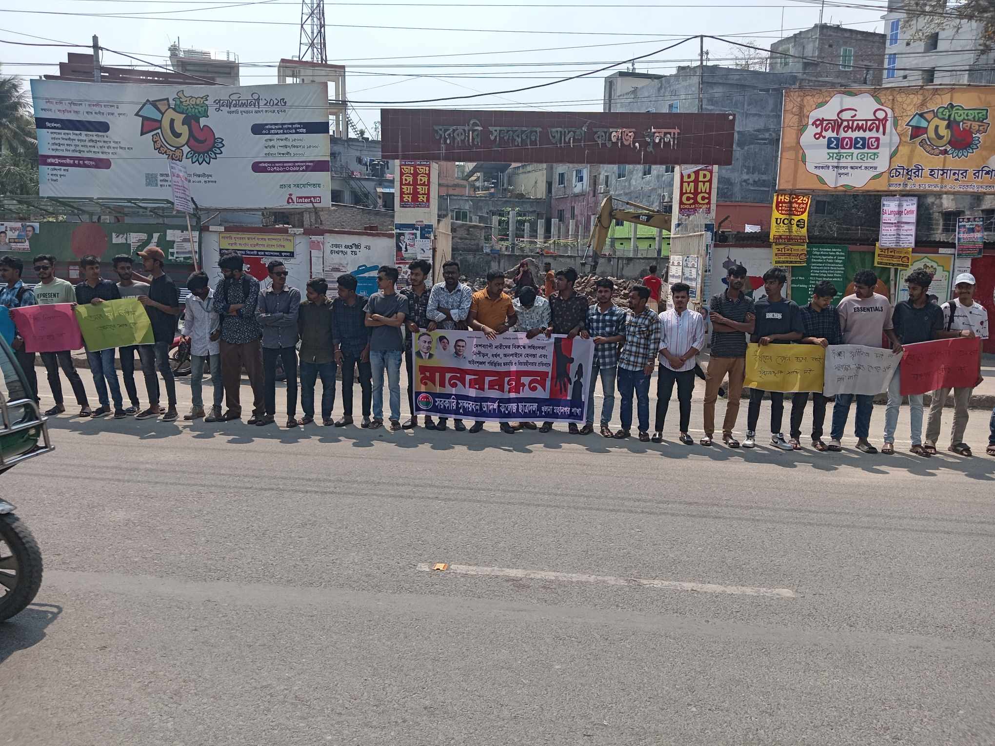 দেশব্যাপী নারীদের বিরুদ্ধে সহিংসতা, নিপীড়ন, ধর্ষণ, অনলাইনে হেনস্তা এবং আইনশৃঙ্খলা পরিস্থিতির সার্বিক অবনতি ও বিচারহীনতার প্রতিবাদে কেন্দ্র ঘোষিত অংশ হিসাবে মানববন্ধনের আয়োজন করে বাংলাদেশ জাতীয়তাবাদী ছাত্রদল খুলনা সরকারি সুন্দরবন আদর্শ কলেজ শাখা ছাত্রদল।