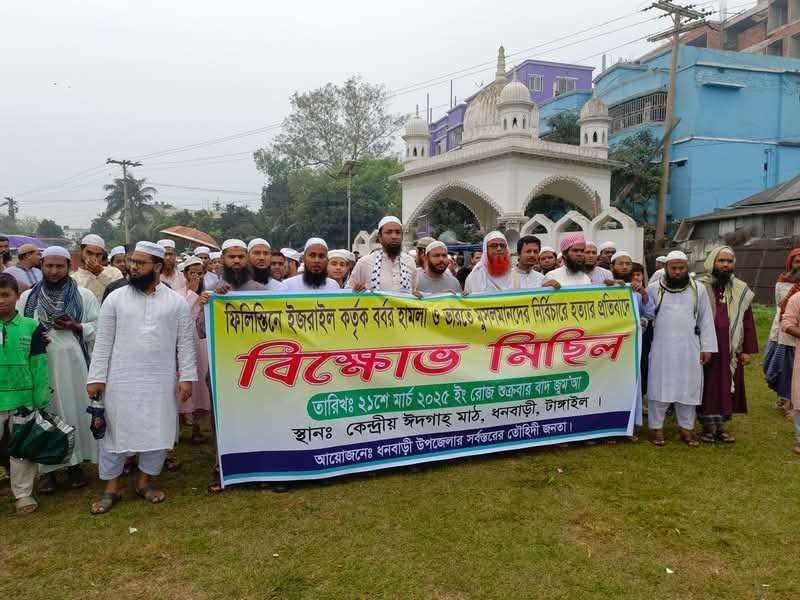 ২১শে মার্চ ২০২৫ ইং রোজ শুক্রবার বাদ জুম'আ নামাযের পরে ধনবাড়ী কেন্দ্রীয় ঈদগাহ্ মাঠ থেকে একটি বিশাল বিক্ষো*ভ মিছিল বের হয়ে ঢাকা-টাঙ্গাইল- জয়দেবপুর- জামালপুর মহাসড়ক সহ ধনবাড়ী বাজার প্রদক্ষিণ করে বি* ক্ষোভ মিছিলটি ধনবাড়ী মডেল মসজিদ এর সামনে গিয়ে শেষ হয়।