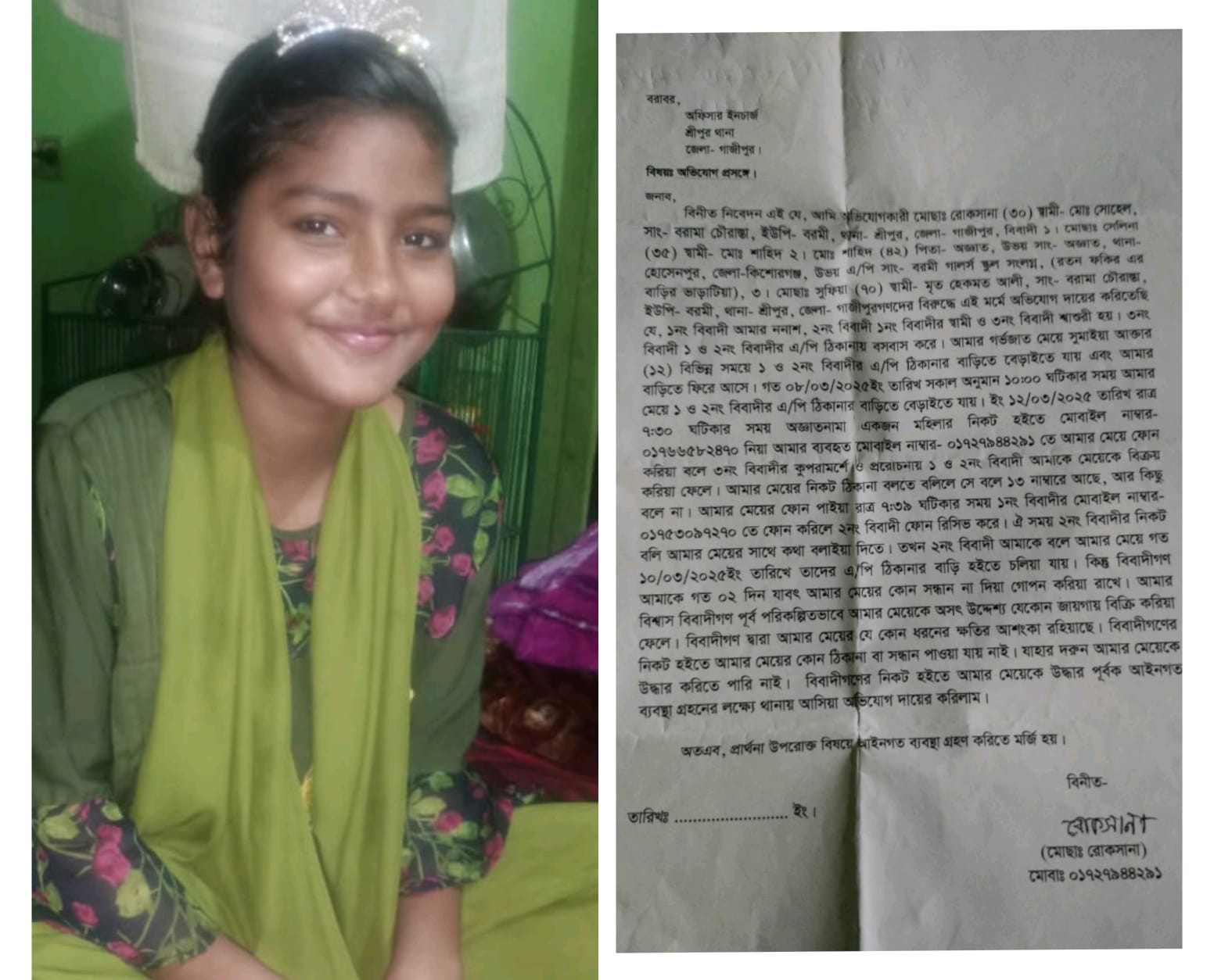 গাজীপুরের শ্রীপুর উপজেলার বরমি গ্রামের রোকসানা ও সোহেল, এর ১২ বছরের কন্যা সুমাইয়া আক্তার এক মাস আগে , ফুফু সেলিনা ও ফুফা মোঃ শাহিদ এর সাথে ঢাকা যায়। ফুফু সেলিনা জানান মেয়েকে বাসার কাজে দিয়েছি ভালো আছে, কিন্তু পরে কোন এক অপরিচিত নাম্বার থেকে সুমাইয়া আক্তার কল দিয়ে মা বাবাকে বলেছিলেন, আমাকে দুই লক্ষ টাকা বিক্রি করে দিয়েছে ফুফু। তুমরা আমাকে বাচাও!