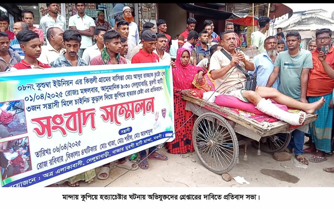 নওগাঁর মান্দায় পারিবারিক বিরোধের জের ধরে চাইনিজ কুড়াল দিয়ে কুপিয়ে এক ব্যক্তিকে হত্যাচেষ্টার ঘটনায় অভিযুক্তদের গ্রেপ্তারের দাবিতে প্রতিবাদ সভা অনুষ্ঠিত হয়েছে।