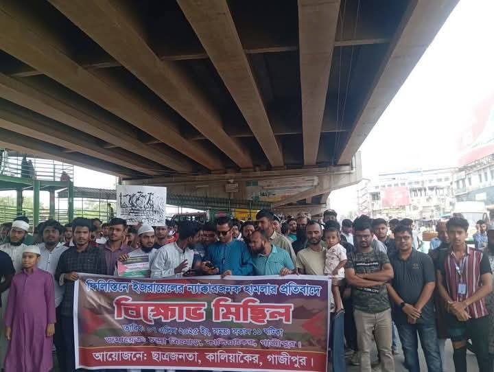ফিলিস্তিনে ইসরায়েলি বাহিনীর নৃশংস হামলার প্রতিবাদে গাজীপুরের কালিয়াকৈর উপজেলার চন্দ্রা ত্রিমোড়ে আজ সোমবার (৭ এপ্রিল ) সকাল ১১টায় ছাত্র জনতার ব্যানারে এক প্রতিবাদ বিক্ষোভ মিছিল অনুষ্ঠিত হয়।