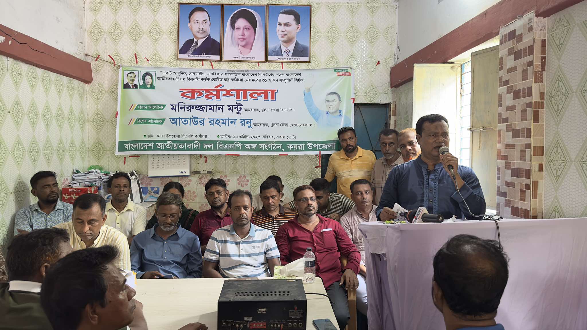 নুরুল ইসলাম খোকা, সদস্য সচিব ডিএম হেলাল উদ্দিন, যুগ্ম আহবায়ক প্রভাষক রবিউল ইসলাম, নজরুল ইসলাম, উপজেলা ছাত্রদলের আহবায়ক আরিফ বিল্যাহ সবুজ, সদস্য সচিব মাহমুদ হাসান, ছাত্র নেতা ইমরান হোসেন প্রমুখ। কর্মশালায় কয়রা উপজেলা বিএনপি ও তার সহযোগী সংগঠনের নেতাকর্মী অংশ গ্রহন করেন। পরে জেলা বিএনপির আহবায়ক মনিরুজ্জামান মন্টু কয়রা বাজারে ব্যবসায়ীদের মাঝে বিএনপি ৩১ দফা দাবি বাস্তবায়নে লিফলেট বিতরন করেন।