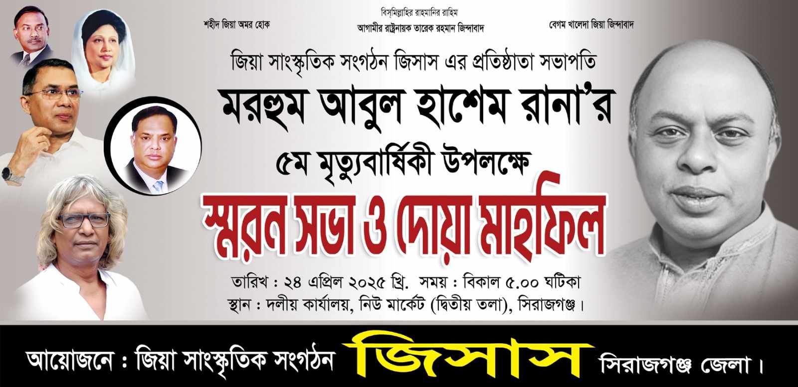 উক্ত আলোচনা সভা সিরাজগঞ্জ জেলা জিয়া সাংস্কৃতিক সংগঠন জিসাস এর সহ-সভাপতি মো, আতিকুর রহমান খন্দকারের সভাপতিত্বে এবং সাংগঠনিক সম্পাদক জাহিদুল হকের উপস্থাপনায় উক্ত দোয়া মাহফিলে জিয়া সাংস্কৃতিক সংগঠন জিসাস এর সকল নেতাকর্মী বক্তব্য রাখেন, তারা বলেন, মরহুম আবুল হাশেম রানা ছিলেন একজন প্রকৃত জিয়ার সৈনিক,শহীদ জিয়ার আদর্শ নিয়েই তিনি গড়ে তুলেছেন জিয়া সাংস্কৃতিক সংগঠন জিসাস,হাটি হাটি পা পা করে ৩৩ টি বছর অতিক্রম করেছে জিসাস। মানুষের ভালোবাসার একটি সংগঠন জিসাস অথচ যে মানুষের জন্য আমরা জিসাস পেয়েছি তিনি আর আমাদের মাঝে নেই,অত্যন্ত ভারাক্রান্ত মন নিয়ে বলতে চাই তাকে ছাড়া জিসাস সত্যিই একটা শুন্য জায়গায় রয়েছে।