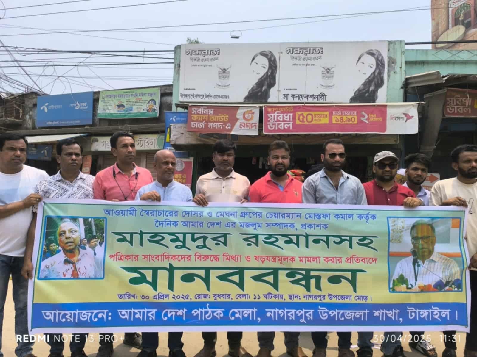 দৈনিক আমার দেশ পত্রিকার সম্পাদক মাহমুদুর রহমানসহ দেশের নিরপেক্ষ সাংবাদিকদের বিরুদ্ধে মেঘনা গ্রুপের চেয়ারম্যান ও ৭১ টেলিভিশনের মালিক মোস্তফা কামালের দায়েরকৃত মিথ্যা ও ষড়যন্ত্রমূলক মামলা প্রত্যাহারের দাবিতে টাঙ্গাইলের নাগরপুরে মানববন্ধন ও প্রতিবাদ সমাবেশ অনুষ্ঠিত হয়েছে।