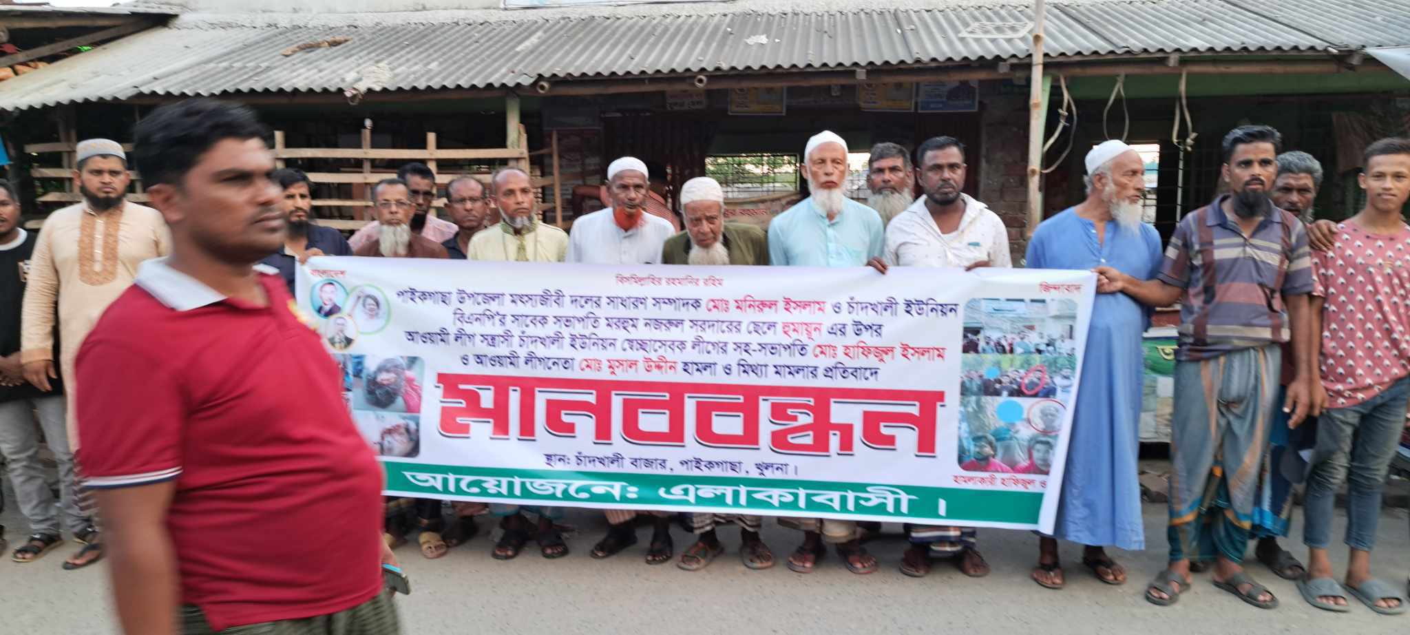 পাইকগাছার চাঁদখালী ইউপি'র বিএনপির সাবেক সভাপতির ছেলে হুমায়ুন ও মৎসীজীবী দলের সম্পাদক মনিরুলসহ নীরিহ ব্যক্তিদের নামে চুরি ও শ্লীলতাহানির মামলার প্রতিবাদে মানববন্ধন হয়েছে। শনিবার বিকেলে চাঁদখালী বাজারস্থ বিএনপির দলীয় কার্যালয়ের সামনে স্থানীয় বিএনপি নেতা নজরুল সরদারের সভাপতিত্বে এ কর্মসূচি পালিত হয়।