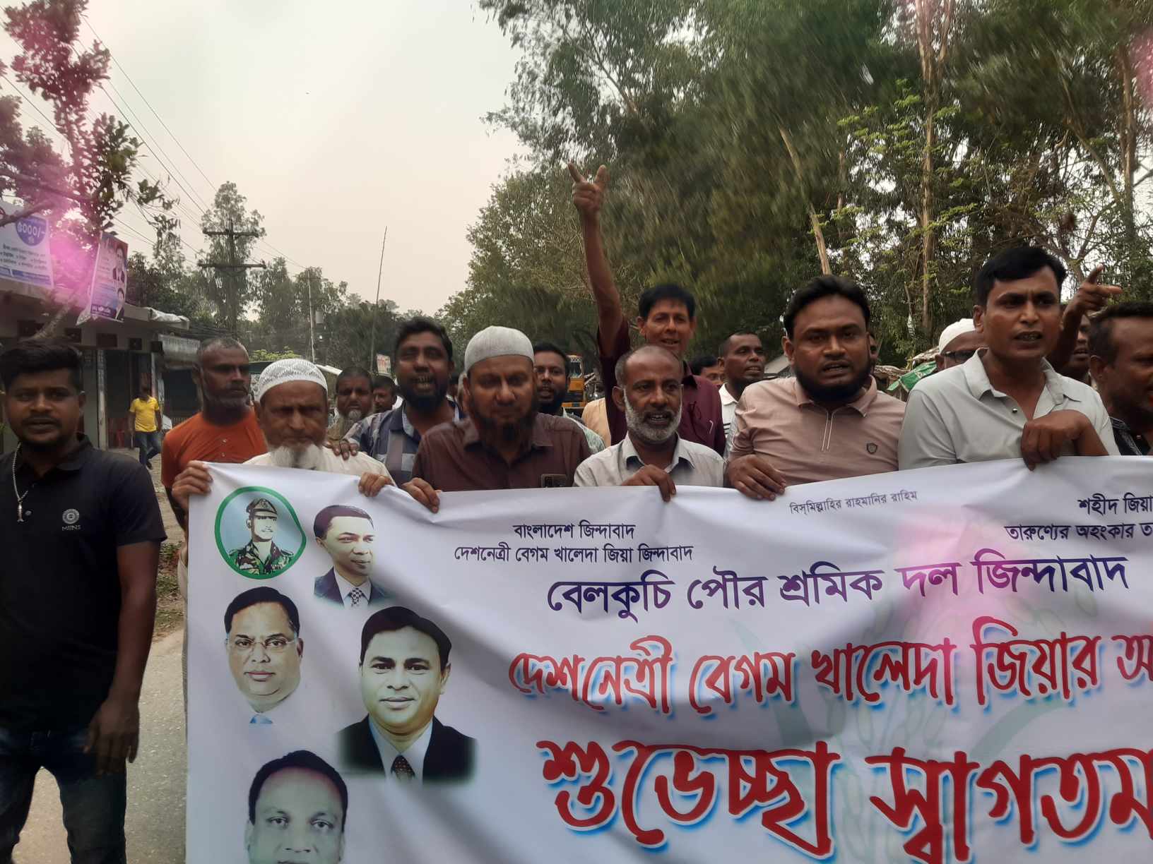 সিরাজগঞ্জের বেলকুচিতে বাংলাদেশ জাতীয়তাবাদী দল বিএনপি'র চেয়ার পারসন সাবেক প্রধানমন্ত্রী দেশনেত্রী বেগম খালেদা জিয়া বাংলাদেশে আগমন উপলক্ষে বেলকুচি পৌর শ্রমিক দলের উদ্যোগে আনন্দ মিছিল অনুষ্ঠিত হয়েছে।৬ মে ( মঙ্গলবার ) বিকাল ৫ ঘটিকার সময় ঐতিহ্যবাহী আলহাজ্ব সিদ্দিকী উচ্চ বিদ্যালয় গেট সংলগ্ন বেলকুচি পৌর শ্রমিক দলের অস্থায়ী কার্যালয় থেকে মিছিলটি শুরু হয়।