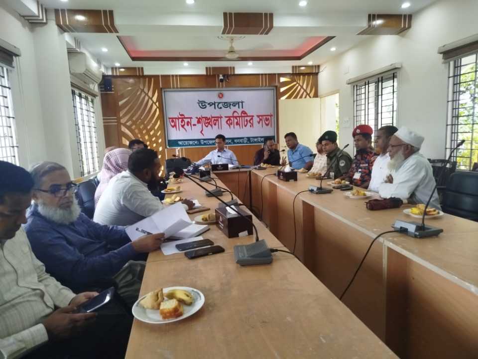 ধনবাড়ী উপজেলা সহকারী কমিশনার ভূমি সায়েম ইমরান এর সঞ্চালনায় ধনবাড়ী থানার অফিসার ইনচার্জ এস এম শহিদুল্লাহ ধনবাড়ী উপজেলার আইন শৃঙ্খলা পরিস্থিতি নিয়ে বিস্তারিত আলোচনা করেন । তিনি বলেন, " মাদকের বিরুদ্ধে ধনবাড়ী থানায় অতীতের যে কোন সময়ের তুলনায় মামলার সংখ্যা বৃদ্ধি পেয়েছে । পুলিশের তিনটা টহল টীম রাতভর ধনবাড়ী উপজেলাব্যাপী ঘুরে বেড়াচ্ছে। কোরবানি ঈদে গরুর ট্রাকসহ অন্যান্য যান চলাচল বৃদ্ধি পাবে, তাই ধনবাড়ী থানা পুলিশ সবসময় এ ব্যাপারে সতর্ক থাকবে ।