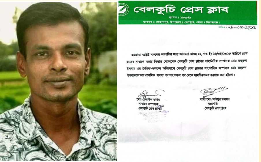 সাময়িকভাবে বহিষ্কার এ-র প্রকাশ করেন। গত ১৬/৪/২৫ তাখিরে বেলকুচি প্রেসক্লাবের সাধারণ সভায় জহুরুল কে বরখাস্ত সিদ্ধান্ত নেন।