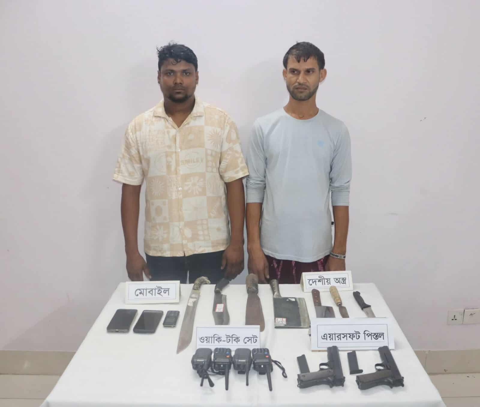 অভিযানকালে তাদের কাছ থেকে উদ্ধার করা হয় ৩টি দেশীয় তৈরি দা, ২টি বড় ছুরি, ২টি ছোট ছুরি, ২টি এয়ারসফট পিস্তল, ৪টি ওয়াকিটকি সেট এবং ৩টি মোবাইল ফোনসহ বিভিন্ন সরঞ্জাম।