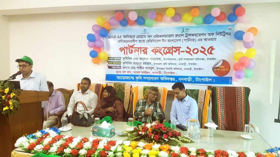 টাঙ্গাইলের ধনবাড়ী উপজেলায় ২০২৪-২৫ অর্থবছরে প্রোগ্রাম অন এগ্রিকালচারাল রুরাল ট্রান্সফরমেশন অফ নিউট্রিশন এন্টারপ্রেনরশীপ এন্ড রেজিলিয়েন্স ইন বাংলাদেশ (পার্টনার) এর আওতায় পার্টনার কংগ্রেস- ২০২৫ অনুষ্ঠিত হয়েছে রবিবার (২৯জুন) সকালে ধনবাড়ী উপজেলা মডেল মসজিদের হলরুমে ।