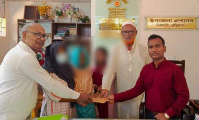 আছমা খাতুন বিজ্ঞান ও প্রযুক্তি বিশ্ববিদ্যালয়ে ভর্তির সুযোগ পেলেও অর্থের অভাবে ভর্তি হতে না পারায় উপজেলা নির্বাহী অফিসার বরাবর একটি আবেদন করেন। বিষয়টি জানতে পেরে নির্বাহী অফিসার সবুজ কুমার বসাক আছমাকে ডেকে উপজেলা প্রশাসনের পক্ষ থেকে ভর্তির জন্য নগত ২০ হাজার টাকা তুলে দেন। উপস্থিত আছমার মা ছামছুন্নাহার বেগম ইউএনও’র সহযোগিতা পাওয়ায় তারা আল্লাহর কাছে শুকরিয়া আদায় করেন এবং ইউএনও কে ধন্যবাদ জানান। ইউএনও’র সহযোগিতা পেয়ে আছমা নিজেও অনেক খুশি। শিক্ষার্থী আছমার মা বলেন, মেয়ে আমার অনেক কষ্টে পড়াশুনা করেছে যখন বড় বিশ^বিদ্যালয়ে ভর্তি হইবে শুনলাম আর ২০ হাজার টাকা লাগতে তখন গলা শুকিয়ে গিয়েছিল কোন উপায়ও ছিল না, পরে ইউএনও স্যার জানতে পেরে পুরো টাকাই দিয়ে আমার মেয়ে ও আমাদের স্বপ্ন পুরনের জন্য সুযোগ করে দিল। উপজেলা নির্বাহী অফিসার সবুজ কুমার বসাক বলেন, শুধু আছমা নয় এরকম যারা সম্ভাবনাময় রয়েছে অর্থের অভাবে এগিয়ে যেতে পাচ্ছেনা তাদের সহযোগীতা করা হবে। বৃহস্পতিবার বিকালে উপজেলা নির্বাহী অফিসারের অফিস কার্যালয়ে শিক্ষার্থী আছমা খাতুনের হাতে ২০ হাজার টাকা তুলে দেন উপজেলা নির্বাহী অফিসার সবুজ কুমার বসাক, উপজেলা বিএনপি’র সাবেক সভাপতি বীর মুক্তিযোদ্ধা আব্দুল বারি সরকার।