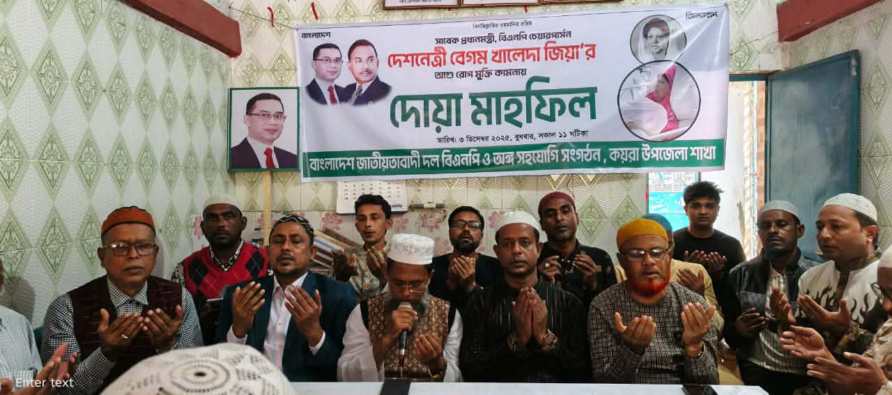 খুলনার কয়রায় বাংলাদেশ জাতীয়তাবাদী দল (বিএনপি'র) কয়রা উপজেলা শাখার আয়োজনে বিএনপির চেয়ারপার্সন সাবেক প্রধানমন্ত্রী বেগম খালেদা জিয়ার সুস্থতা কামনায় দোয়া ও মিলাদ মাহফিল অনুষ্ঠিত হয়েছে।