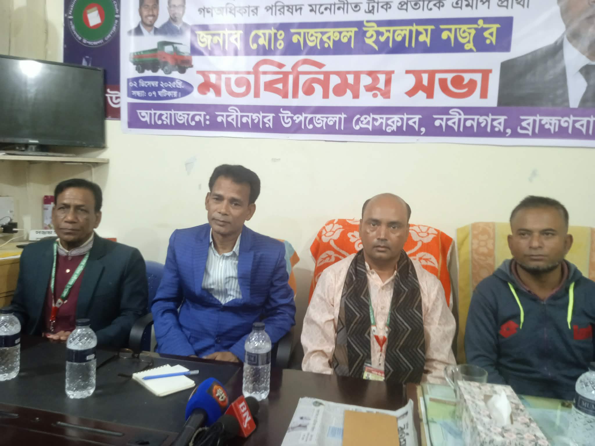 আসন্ন ত্রয়োদশ জাতীয় সংসদ নির্বাচনে ব্রাহ্মণবাড়িয়া-৫ নবীনগর ২৪৭ আসনে গণ অধিকার পরিষদ মনোনীত ট্রাক প্রতীকে প্রার্থী মোহাম্মদ নজরুল ইসলাম নজু ২ ডিসেম্বর মঙ্গলবার রাতে নবীনগর উপজেলা প্রেসক্লাবে সাংবাদিকদের সাথে মতবিনিময় করেন। এসময় সাংবাদিকদের বিভিন্ন প্রশ্নের জবাবে প্রধান অতিথির বক্তব্যে তিনি বলেন, আমি এমপি হলেও থাকবো, না হলেও আরো বেশি থাকব। এলাকায় আরো বেশি কাজ করতে হলে সংসদে যেতে হবে, জনপ্রতিনিধি না হলে এলাকায় মনপ্রতভাবে সম্পূর্ণ উন্নয়ন কাজ করা সম্ভব নয়। গত ১৫ বছর মানুষ ভোট দিতে পারে নাই, এবার নিরপেক্ষ একটি ভোট হবে , এলাকার উন্নয়নের স্বার্থে একজন ভালো মানুষকে মানুষ ভোট দিবেন, অন্যায়ের বিরুদ্ধে ন্যায়ের প্রতিক ভিপি নূর গণমানুষের কথা বলেন, এই আদর্শে অনুপ্রাণিত হয়ে সাধারণ মানুষ ট্রাক মার্কায় ভোট দিয়ে নবীনগর উন্নয়নকে ত্বরান্বিত করবে,এটা আমার বিশ্বাস। আমি সাংবাদিক সহ সকলের সহযোগিতা কামনা করছি। সকলের সহযোগিতা থাকলে, মানুষের দোয়া ও ভোট পেয়ে আমি ইনশাল্লাহ পাস করবো।