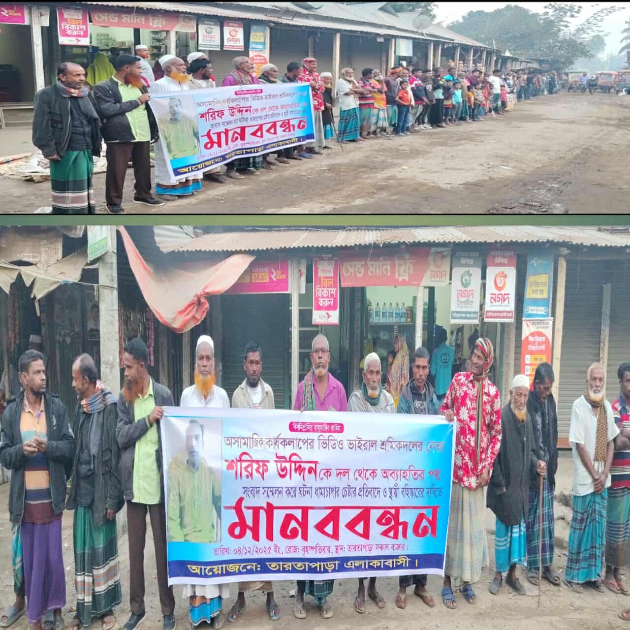 জামালপুরের মাদারগঞ্জে অসামাজিক কার্যকলাপের ভিডিও ভাইরাল হওয়া শ্রমিক দল নেতা শরিফ উদ্দিনকে দল থেকে অব্যাহতি দেওয়ার পরও সংবাদ সম্মেলন করে ঘটনাকে ধামাচাপা দেওয়ার চেষ্টা করার প্রতিবাদে মানববন্ধন অনুষ্ঠিত হয়েছে।