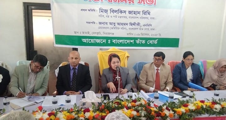 মঙ্গলবার দুপুরে তাঁত শিল্পের উন্নয়নে সিরাজগঞ্জের বেলকুচি উপজেলা তামাই অগ্রণী সংসদ ক্লাবে তাঁতিদের সাথে মতবিনিময় সভায় প্রধান অতিথি বস্র ও পাট মন্ত্রনালয়ের সচিব মিজ্ বিলকিস জাহান রিমি তাঁতিদের কথা শোনেন।