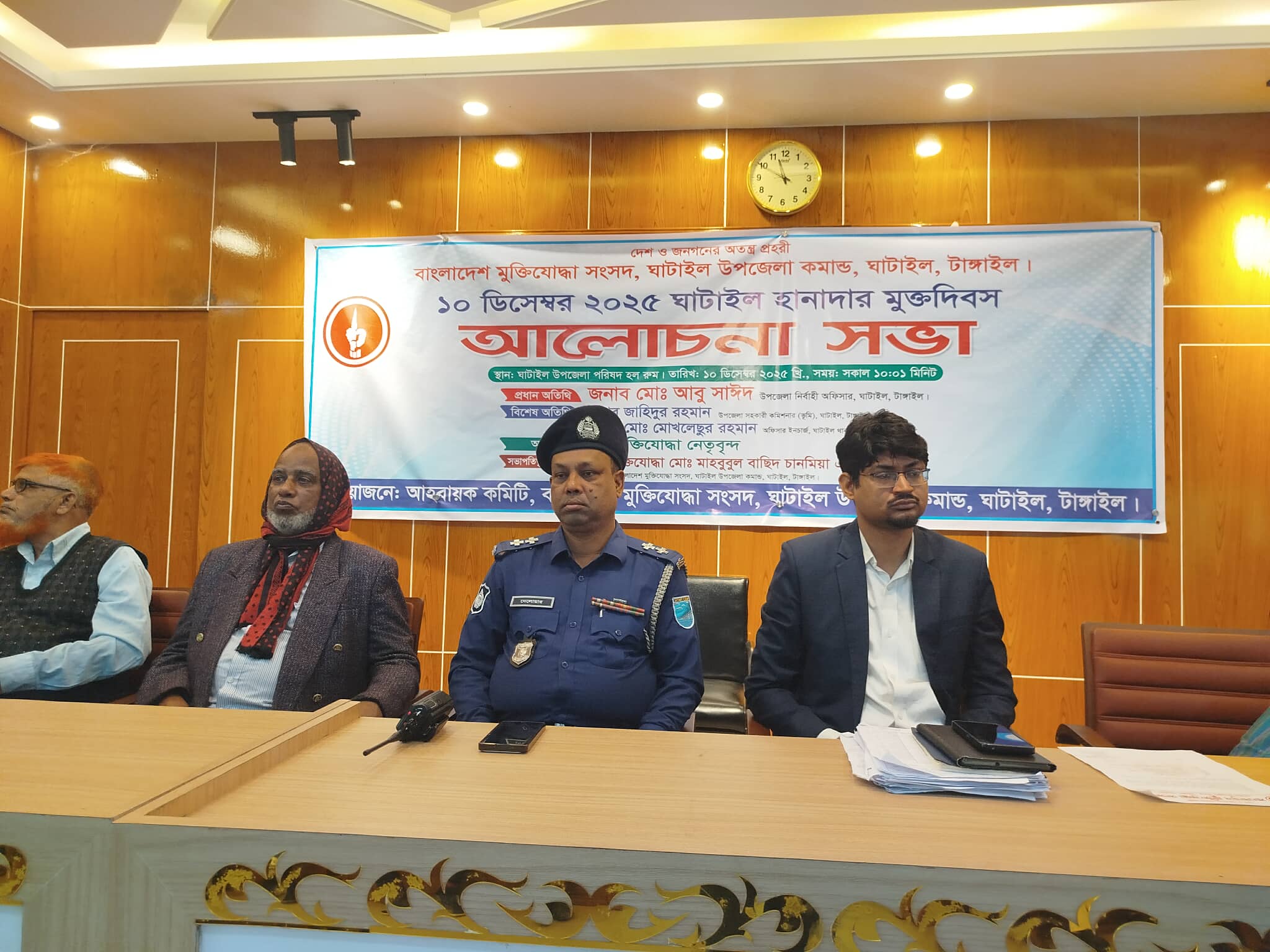 টাঙ্গাইলের ঘাটাইলে নানা কর্মসূচির মধ্য দিয়ে পালিত হলো হানাদার মুক্ত দিবস । দিবসটি উপলক্ষে বুধবার (১০ ডিসেম্বর) সকালে বাংলাদেশ মুক্তিযোদ্ধা সংসদ ঘাটাইল উপজেলা কমান্ড ও উপজেলা প্রশাসনের যৌথ আয়োজনে জাতীয় পতাকা উত্তোলন, মুক্তিযোদ্ধা স্মৃতিস্তম্ভে ও শহীদ মিনারে পুষ্পস্তবক অর্পণ,নব নির্মিত মুক্তিযোদ্ধা কমপ্লেক্সের উদ্বোধন,আলোচনা সভা ও হানাদার মুক্ত দিবসের শহীদ ও মৃত মুক্তিযোদ্ধাদের জন্য দোয়া মাহফিল অনুষ্ঠিত হয়েছ।