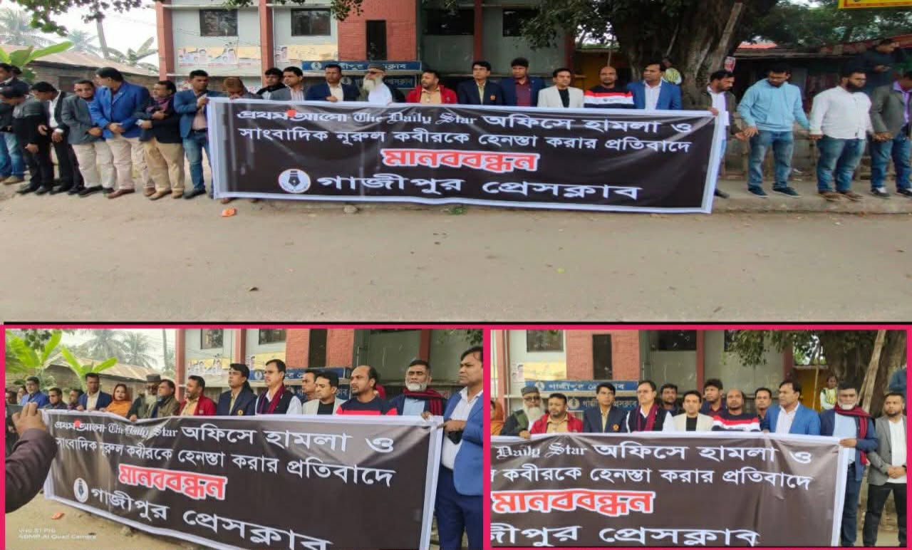 দৈনিক প্রথম আলো ও দ্য ডেইলি স্টার কার্যালয়ে হামলা, অগ্নিসংযোগের অপচেষ্টা এবং জ্যেষ্ঠ সাংবাদিক নূরুল কবীরকে হেনস্তাকারীদের দ্রুত আইনের আওতায় আনার দাবিতে গাজীপুর প্রেসক্লাবের সামনে মানববন্ধন কর্মসূচি পালন করেছেন সাংবাদিকরা।