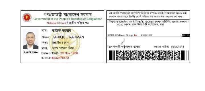 প্রকাশিত তথ্য অনুযায়ী, পরিচয়পত্রে তারেক রহমানের ব্যক্তিগত তথ্য উল্লেখ রয়েছে। এ বিষয়ে সংশ্লিষ্ট কর্তৃপক্ষের পক্ষ থেকে এখনো আনুষ্ঠানিক কোনো বক্তব্য পাওয়া যায়নি।