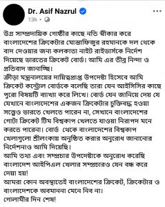 সামাজিক যোগাযোগমাধ্যম ফেসবুকে নিজের ভেরিফায়েড অ্যাকাউন্টে দেওয়া এক পোস্টে আসিফ নজরুল বলেন, উগ্র সাম্প্রদায়িক গোষ্ঠীর চাপের কাছে নতি স্বীকার করে ভারতের ক্রিকেট বোর্ড কলকাতা নাইট রাইডার্সকে নির্দেশ দিয়েছে মুস্তাফিজুর রহমানকে দল থেকে বাদ দিতে। বিষয়টিকে তিনি অত্যন্ত নিন্দনীয় ও অপমানজনক বলে মন্তব্য করেন।