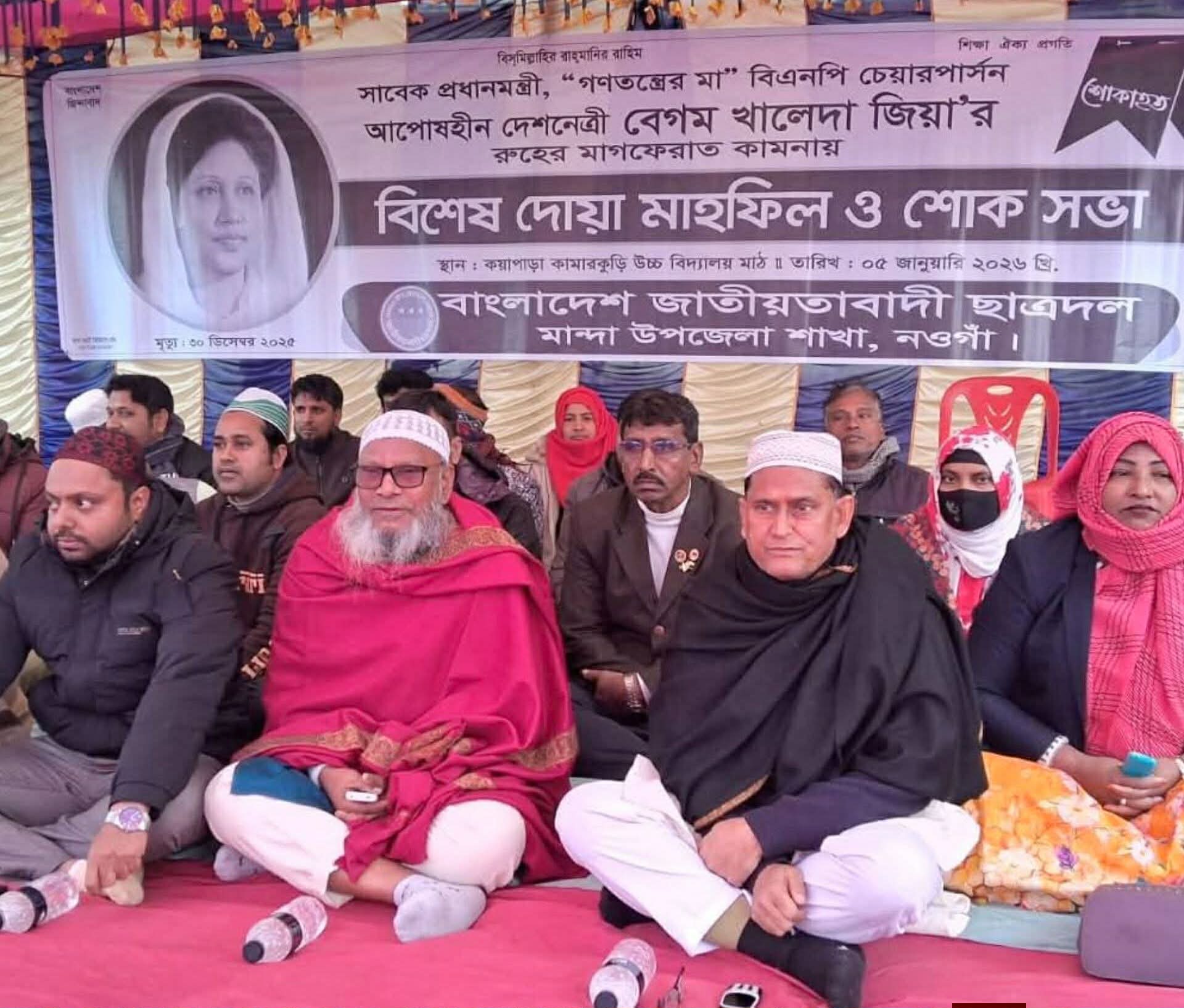 নওগাঁ জেলার মান্দা উপজেলায় বাংলাদেশ জাতীয়তাবাদী ছাত্রদলের উদ্যোগে কয়াপাড়া কামারকুড়ি উচ্চ বিদ্যালয় মাঠে সাবেক প্রধানমন্ত্রী দেশনেত্রী বেগম খালেদা জিয়ার রুহের মাগফিরাত কামনায় দোয়া ও আলোচনা সভা অনুষ্ঠিত।