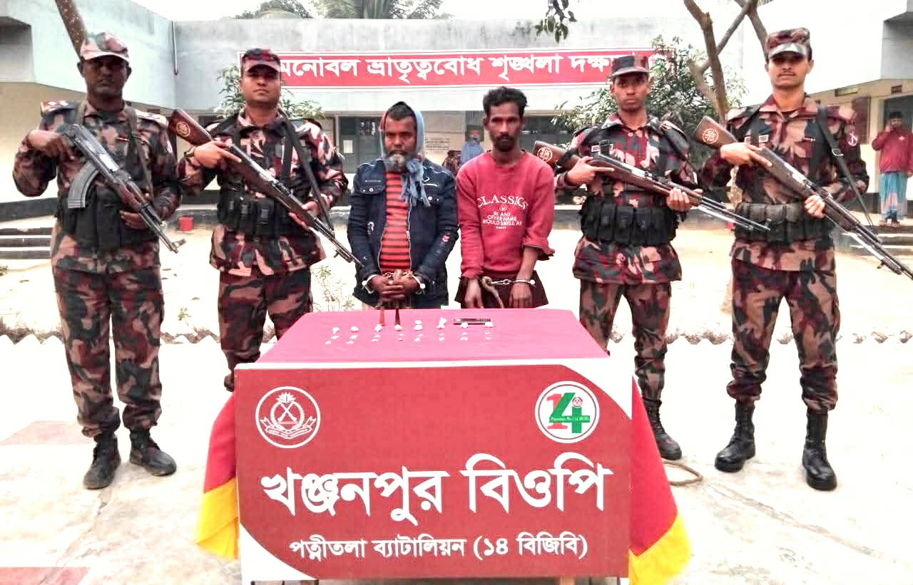 পত্নীতলা ১৪ বিজিবি সূত্র জানায়, ৭ জানুয়ারি ২০২৬ তারিখ বিকাল আনুমানিক ৪ ঘটিকায় ১৪ বিজিবির দায়িত্ব পালন কালে সাপাহার উপজেলার খঞ্জনপুর বিওপির টহল কমান্ডার নায়েক মোঃ পিন্টু মিয়া এর নেতৃত্বে একটি বিশেষ টহল দল সীমান্ত পিলার ২৫১ এমপি হতে আনুমানিক ১.৫ কিঃমিঃ বাংলাদেশের অভ্যন্তরে নওগাঁ জেলাধীন খঞ্জনপুর গুচ্ছ গ্রাম এলাকায় অভিযান পরিচালনা করেন। এ সময় ১৭ পিস ট্যাপেন্টাডল ট্যাবলেট, ১০ পুরিয়া ভারতীয় গাঁজা এবং ১টি মোবাইলসহ ২ জন চোরাকারবারী (১) মোঃ বাবুল (৪৫), পিতা-মোঃ তাউজুল, গ্রাম-শামপুর ও পোস্ট-শামপুর, থানা-পত্নীতলা, জেলা-নওগাঁ (২) মোঃ রিপন (২৮), পিতা-মোঃ আমিনুল ইসলাম, গ্রাম-ধুপিপাড়া, পোষ্ট ও থানা-পার্বর্তীপুর এবং জেলা-দিনাজপুরকে আটক করতে সক্ষম হয়।
