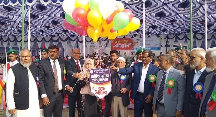 বার্ষিক ক্রিড়া প্রতিযোগিতা অনুষ্ঠানে পায়রা অবমুক্ত করণ ও বেলুন ফেস্টুন উড়িয়ে খেলার শুভ উদ্বোধন ঘোষণা করেন উক্ত খেলার প্রধান অতিথি বেলকুচি উপজেলা সহকারী কমিশনার ভূমি ইশরাত জাহান।