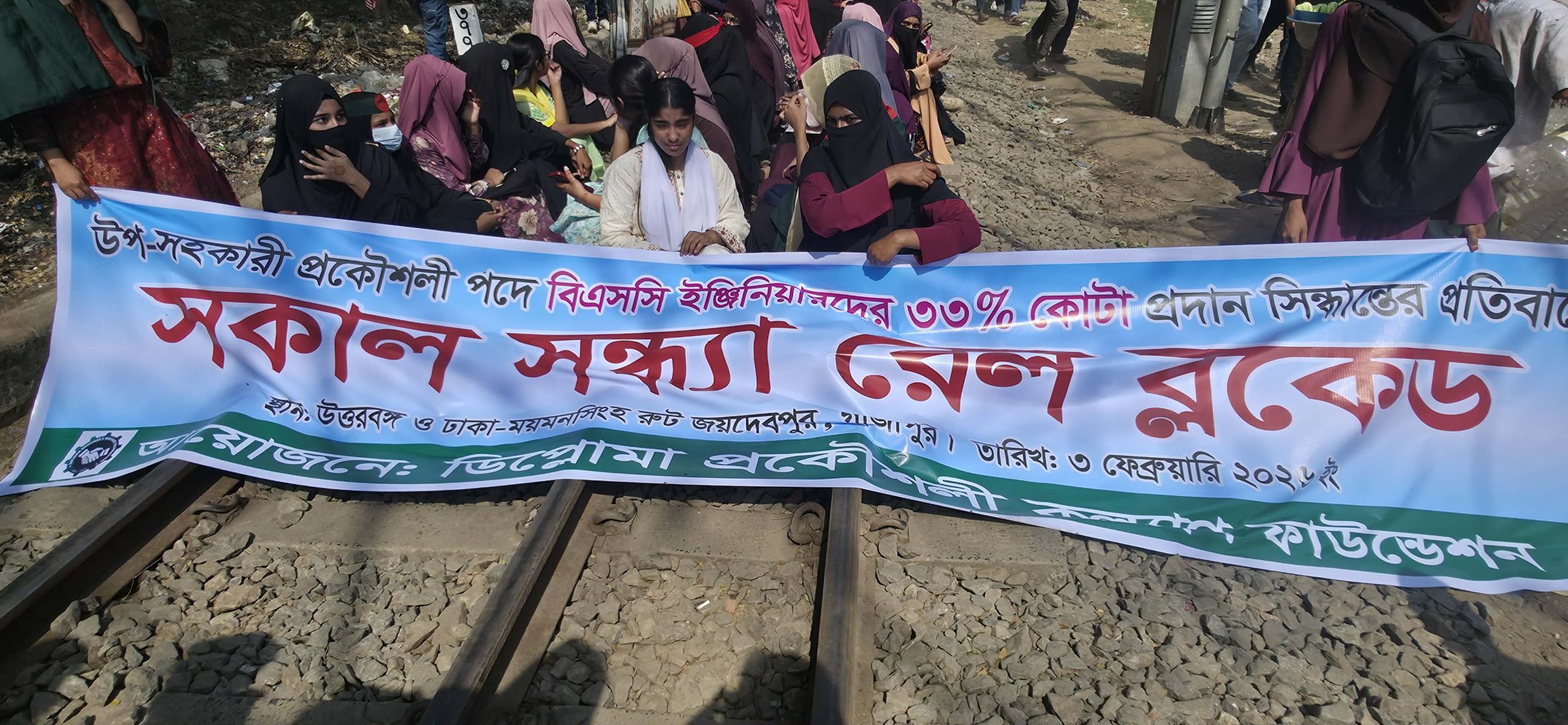 উপসহকারী প্রকৌশলী (১০ম গ্রেড) পদে বিএসসি ইঞ্জিনিয়ারদের জন্য প্রস্তাবিত অযৌক্তিক ৩৩ শতাংশ কোটা প্রদানের সিদ্ধান্তের প্রতিবাদে গাজীপুরসহ সারা বাংলাদেশে ডিপ্লোমা ইঞ্জিনিয়াররা রেল ব্লকেড ও অবস্থান কর্মসূচি পালন করছেন।