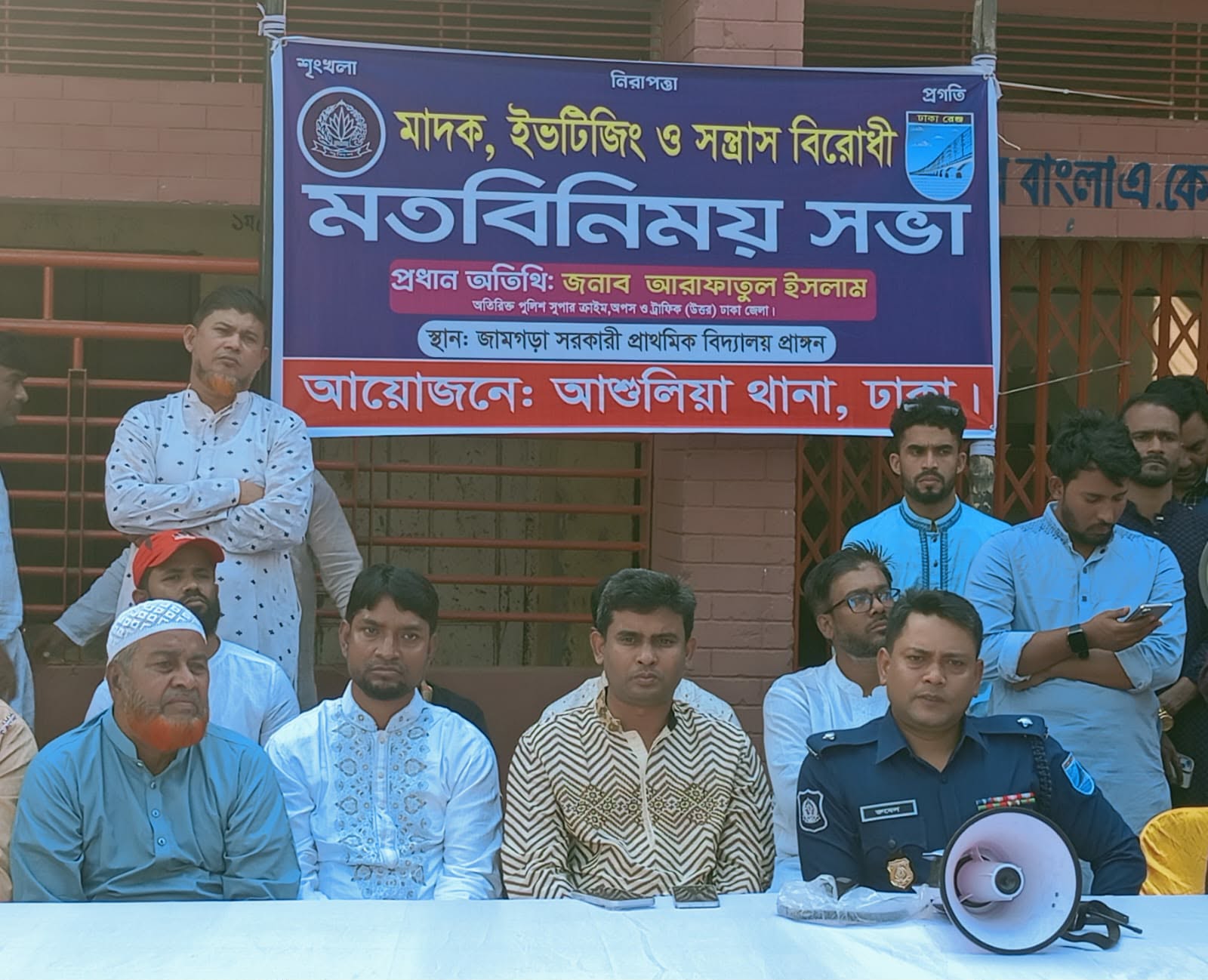 শুক্রবার বিকাল ৩ ঘটিকায় সাভার আশুলিয়া জামগড়া সরকারি প্রাথমিক বিদ্যালয় প্রাঙ্গণে এ সভা অনুষ্ঠিত হয় উক্ত অনুষ্ঠানে প্রধান অতিথি হিসেবে উপস্থিত ছিলেন ঢাকা জেলা উত্তরের অতিরিক্ত পুলিশ সুপার আরাফাতুল ইসলাম (ক্রাইম অফস ও ট্রাফিক ) বিশেষ অতিথি হিসাবে উপস্থিত ছিলেন আশুলিয়া থানা ভারপ্রাপ্ত ওসি রুবেল হাওলাদার সহ বিএনপি নেতৃবৃন্দ ও এলাকাবাসী ।