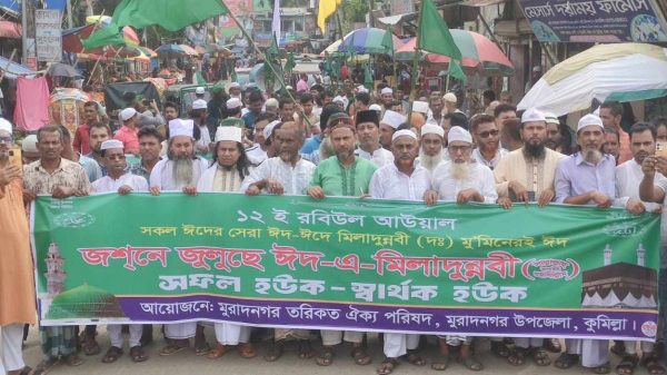 মো:আমিনুল ইসলাম,কুমিল্লা জেলা প্রতিনিধি: কুমিল্লা জেলার মুরাদনগরে পবিত্র ঈদে মিলাদুন্নবী (সাঃ) উপলক্ষে জশনে মিলাদুন্নবী অনুষ্ঠিত হয়েছে। সোমবার বিকেলে উপজেলা পরিষদ প্রাঙ্গণ থেকে শুরু হওয়া এই শোভাযাত্রায় শত শত মুসলমান অংশগ্রহণ