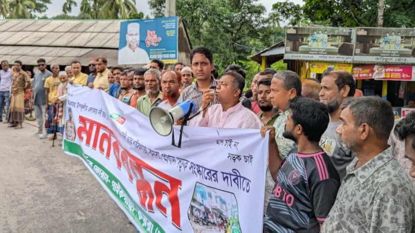 পাইকগাছা(খুলনা)প্রতিনিধি: পাইকগাছায় নদীভাঙন রোধে টেকসই বেড়িবাঁধ নির্মাণ এবং ১৮ মাইল থেকে পাইকগাছা–কয়রা প্রধান সড়ক দ্রুত সংস্কারের দাবিতে মানববন্ধন অনুষ্ঠিত হয়েছে। শুক্রবার সকালে পাইকগাছা–কয়রা নাগরিক ফোরামের আয়োজনে গদাইপুর বাজারে এ কর্মসূচি