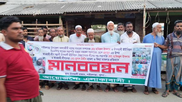 পাইকগাছা প্রতিনিধি:নুরুল আমিন পলাশ পাইকগাছার চাঁদখালী ইউপি’র বিএনপির সাবেক সভাপতির ছেলে হুমায়ুন ও মৎসীজীবী দলের সম্পাদক মনিরুলসহ নীরিহ ব্যক্তিদের নামে চুরি ও শ্লীলতাহানির মামলার প্রতিবাদে মানববন্ধন হয়েছে। শনিবার বিকেলে চাঁদখালী