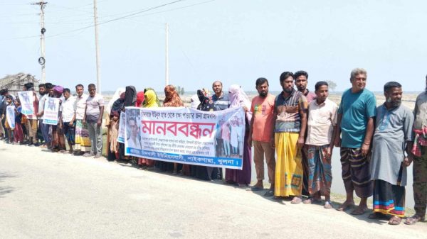পাইকগাছা উপজেলা প্রতিনিধি:নুরুল আমিন পলাশ খুলনার পাইকগাছায় চিংড়ী ঘেরে চাঁদা না দেওয়ায় পানি তুলতে বাঁধা দেওয়ায় প্রায় ৬ হাজার বিঘা জমির ঘের ও মালিকদের পক্ষ থেকে মানববন্ধন অনুষ্ঠিত হয়েছে। এ