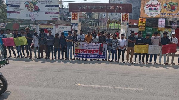 মিলন হোসেন,খুলনা প্রতিনিধি: দেশব্যাপী নারীদের বিরুদ্ধে সহিংসতা, নিপীড়ন, ধর্ষণ, অনলাইনে হেনস্তা এবং আইনশৃঙ্খলা পরিস্থিতির সার্বিক অবনতি ও বিচারহীনতার প্রতিবাদে কেন্দ্র ঘোষিত অংশ হিসাবে মানববন্ধনের আয়োজন করে বাংলাদেশ জাতীয়তাবাদী ছাত্রদল খুলনা