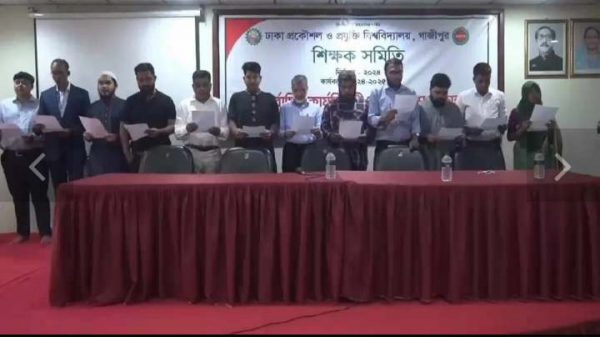 গাজীপুরের ঢাকা প্রকৌশল ও প্রযুক্তি বিশ্ববিদ্যালয়ের (ডুয়েট) নবনির্বাচিত শিক্ষক সমিতির কার্যনির্বাহী কমিটি শপথ নিয়েছে। বুধবার দুপুরে বিশ্ববিদ্যালয়ের অ্যাকাডেমিক ভবনে প্রধান নির্বাচন কমিশনার অধ্যাপক ড. মো. মাহমুদ আলম শিক্ষক সমিতির নেতাদের