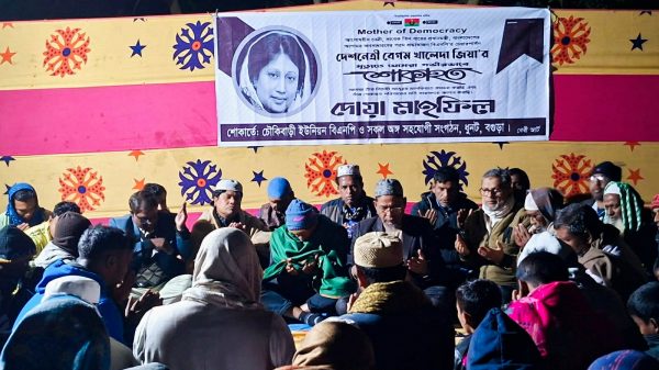 ধুনট (বগুড়া) প্রতিনিধি: বিএনপি চেয়ারপারসন ও সাবেক প্রধানমন্ত্রী মরহুম বেগম খালেদা জিয়ার রূহের মাগফিরাত কামনায় বগুড়ার ধুনট উপজেলার চৌকিবাড়ি ইউনিয়নে বিশেষ দোয়া মাহফিল অনুষ্ঠিত হয়েছে। শুক্রবার বাদ মাগরিব চৌকিবাড়ি ইউনিয়ন