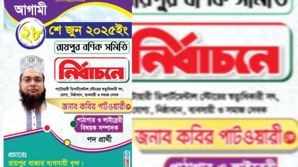 আরিফ হোসেন রুদ্র (রায়পুর,লক্ষ্মীপুর): আসন্ন ২৮ জুন ২০২৫ তারিখে রায়পুরে বণিক সমিতির নির্বাচনকে ঘিরে ব্যবসায়ী সমাজে শুরু হয়েছে ব্যাপক উৎসাহ-উদ্দীপনা। এ নির্বাচনে পাঠাগার ও লাইব্রেরী বিষয়ক পদে প্রার্থী হয়েছেন রায়পুর