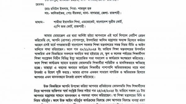 রাজশাহীর বাগমারা উপজেলার গোপালপুর আলিম মাদ্রাসায় কোমলমতি শিক্ষার্থীদের মানববন্ধনে ব্যবহার করার ঘটনায় আইনি পদক্ষেপ গ্রহণ করা হয়েছে। গতকাল, ১৪ মে ২০২৫, বাংলাদেশ সুপ্রিম কোর্টের রাজশাহী জেলার আইনজীবী অ্যাডভোকেট শামিমা ইয়াসমিন