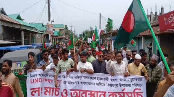 মো.সহিদ মিয়া, সুনামগঞ্জ বিশেষ প্রতিনিধি: বিক্ষুব্ধ জনতায় মুখে এই স্লোগান দিয়ে ১০কিলোমিটার প্রদক্ষিণ করলেন,সুনামগঞ্জের বিশ্বম্ভপুর উপজেলার ইউওন মহোদয় মফিজুর রহমান কে লক্ষ্য করে দীর্ঘদিন যাবত এলাকায় চাঞ্চল্যকর উৎকন্ডা শুরু হচ্ছে।